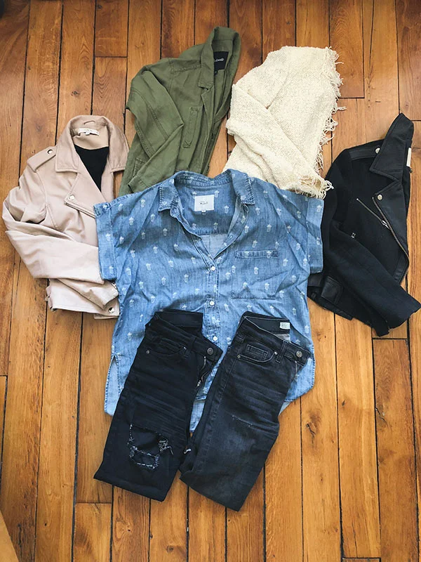 below is another example of a wardrobe web i made for one of my favorite staple tops that i brought to Paris. i included both jackets and jeans so i could see the big picture of all the combo possibilites: