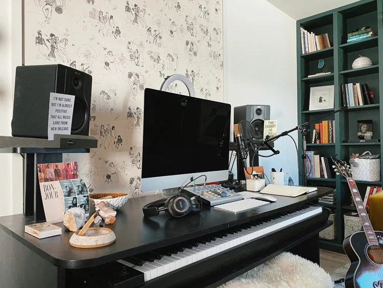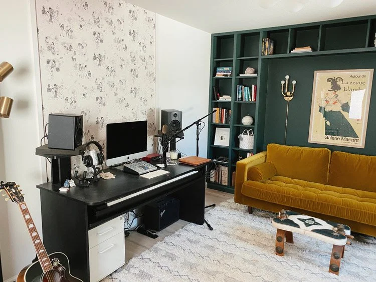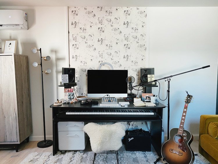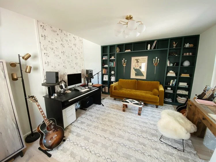 Adding this wallpaper feature wall made a huge difference in my space and really helped to anchor my music desk and break up a big boring white space in the room without feeling too busy or heavy.